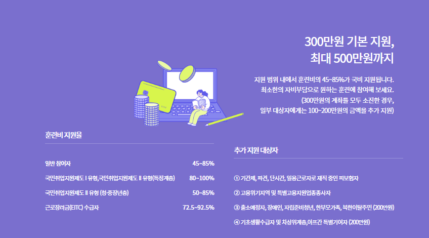 그리고 참고하셔야 할 내용을 하나 알려드리자면 1인 300~500만 원을 지원해 주지만 교육받는 비용 모두를 지원해주지는 않습니다. 훈련비의 45~85%를 지원해 주는 것이니 미리 참고하셔서 신청하시길 바랍니다.
