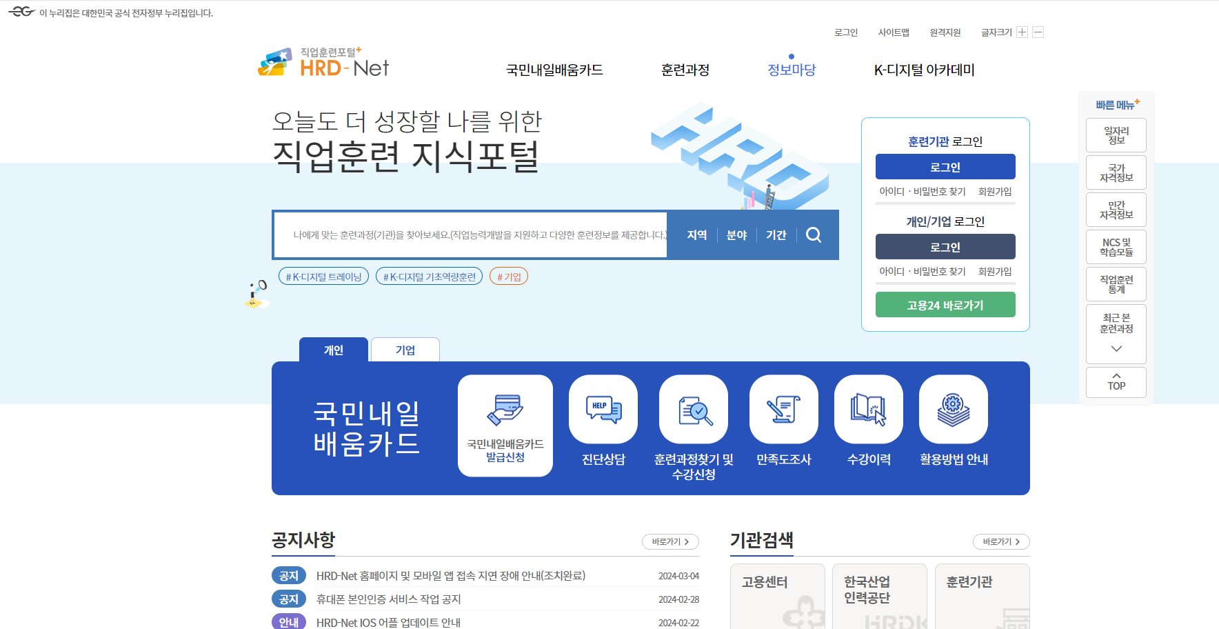 1. 온라인 신청으로 가능하고 HRD-Net 홈페이지 로그인 후 메인화면에서 "국민내일 배움 카드 발급 신청" 눌러줍니다.