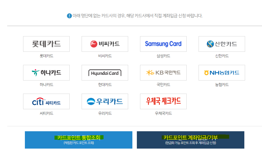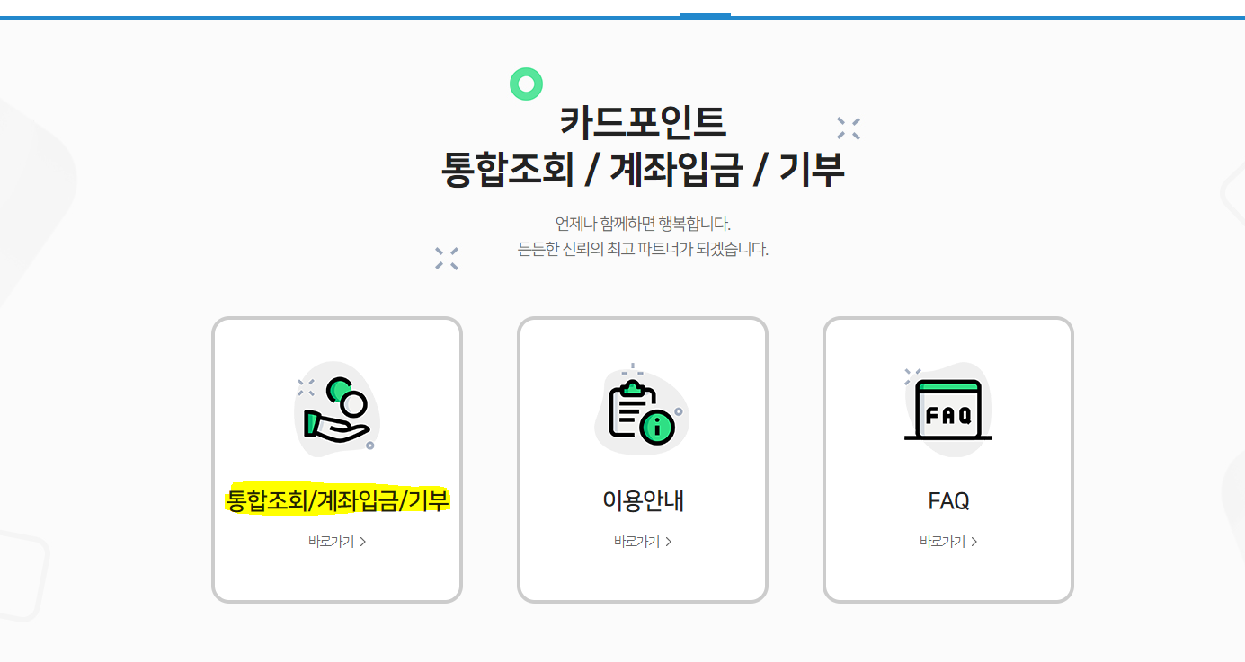 "카드포인트 통합조회" 또는 카드포인트 계좌입금/기부 자신이 원하는 버튼을 눌러 이용하시면 됩니다. 여기까지 잘 따라오셨다면 90% 다 되었습니다. 이후에는 본인이 사용하는 카드사 포인트 확인하시고 계좌 입금받으시면 됩니다.