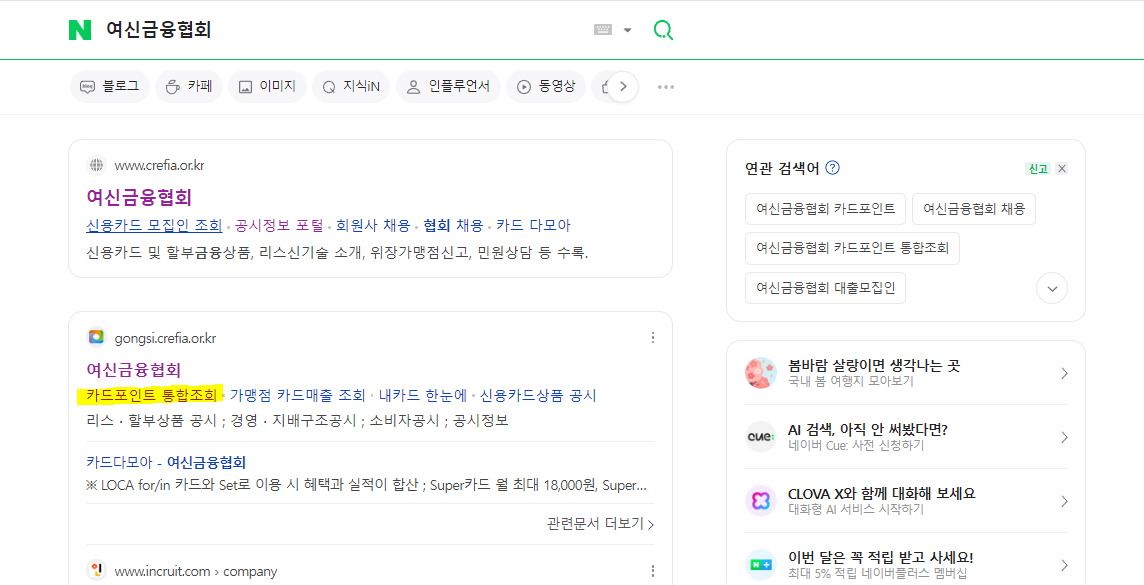 자신이 자주 사용하는 포털 검색창에 "여신금융협회"를 검색하시고 아래 형광색으로 칠해진 "카드포인트 통합 조회" 사이트에 접속하시면 됩니다.