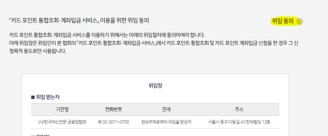 "위임동의" 체크란이 보입니다. 위 체크란을 동의 해주어야 카드 포인트를 환급해 줄 수 있으니 꼭 체크하시고 진행 부탁드립니다.
