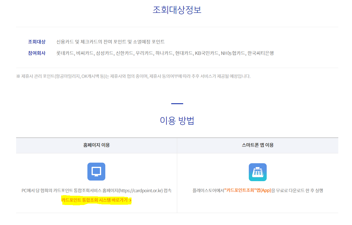 홈페이지 접속 후 스크롤을 위로 올려 내려가면 "카드포인트 통합조회 시스템 바로가기" 버튼이 있습니다. 위 사이트로 접속 하면 됩니다.