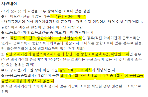 청년 도약 계좌 지원대상에 대해서 알아보겠습니다. 우선 가입일 기준으로 만 19세 이상 34세 이하의 청년이 지원할 수 있습니다. 직전 과세기간의 총급여액이 7천5백만 원 이하, 직전 과세기간의 종합소득과세표준에 합산되는 종합소득금액 6천3백만 원 이하인 경우, 가구원 수에 따른 기준 중위소득 180% 이하에 해당하는 자 직전 3개 과세기간 중 1회 이상 금융 소득 종합과세대상에 해당하지 않는 자로 위에 나와있는 상황에 해당이 되는 분들이 지원할 수 있겠습니다.