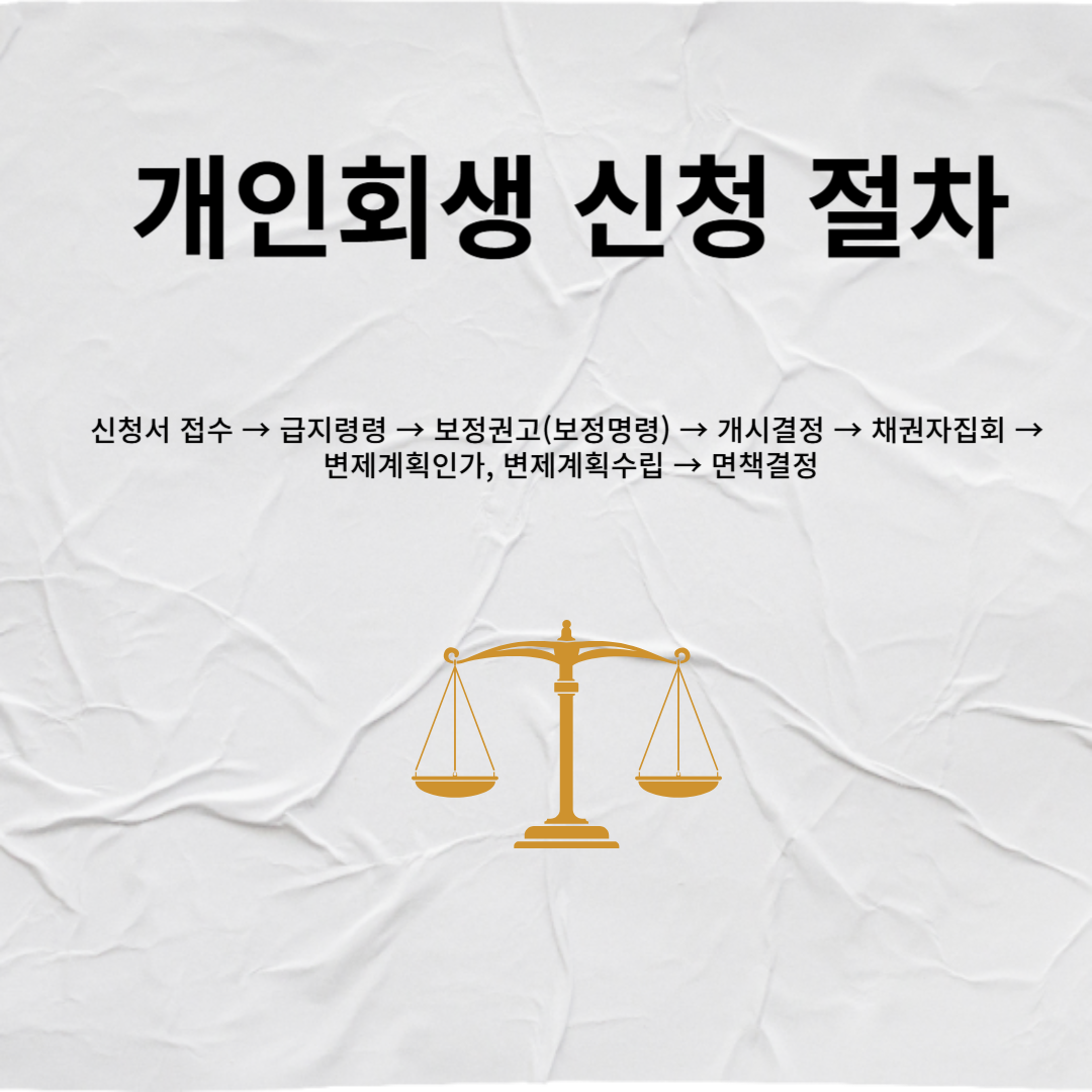 신청서 접수 > 급지령령 > 보정권고(보정명령) > 개시결정 > 채권자집회 > 변제계획인가, 변제계획수립 > 면책결정