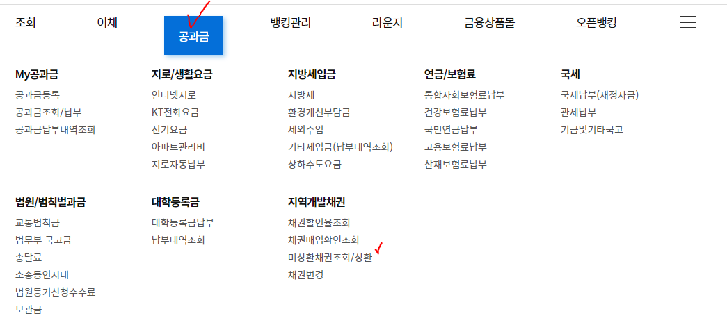2. 상단의 '공과금' 메뉴에서 '미상환채권조회/상환' 버튼을 접속해 줍니다.