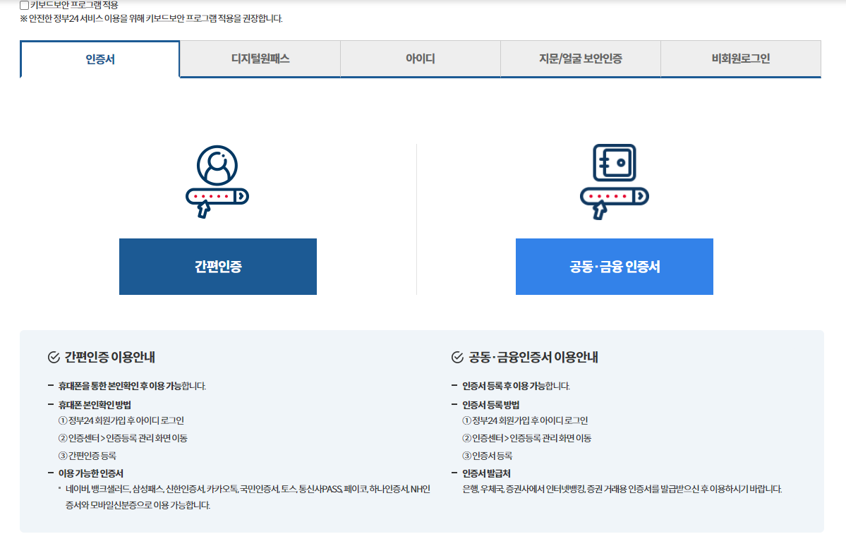 2. 간편 인증 혹은 공동(금융) 인증서 인증을 합니다.