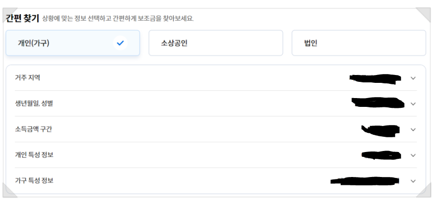 3. 자신에 상황에 맞게 개인(가구), 소상공인, 법인 중 해당되는 곳에 체크를 해주시고 위 사진에 나와 있는 순서대로 거주지역, 생년월일, 성별, 소득금액 구간, 개인 특성정보, 가구 특성 정보를 작성해 줍니다.